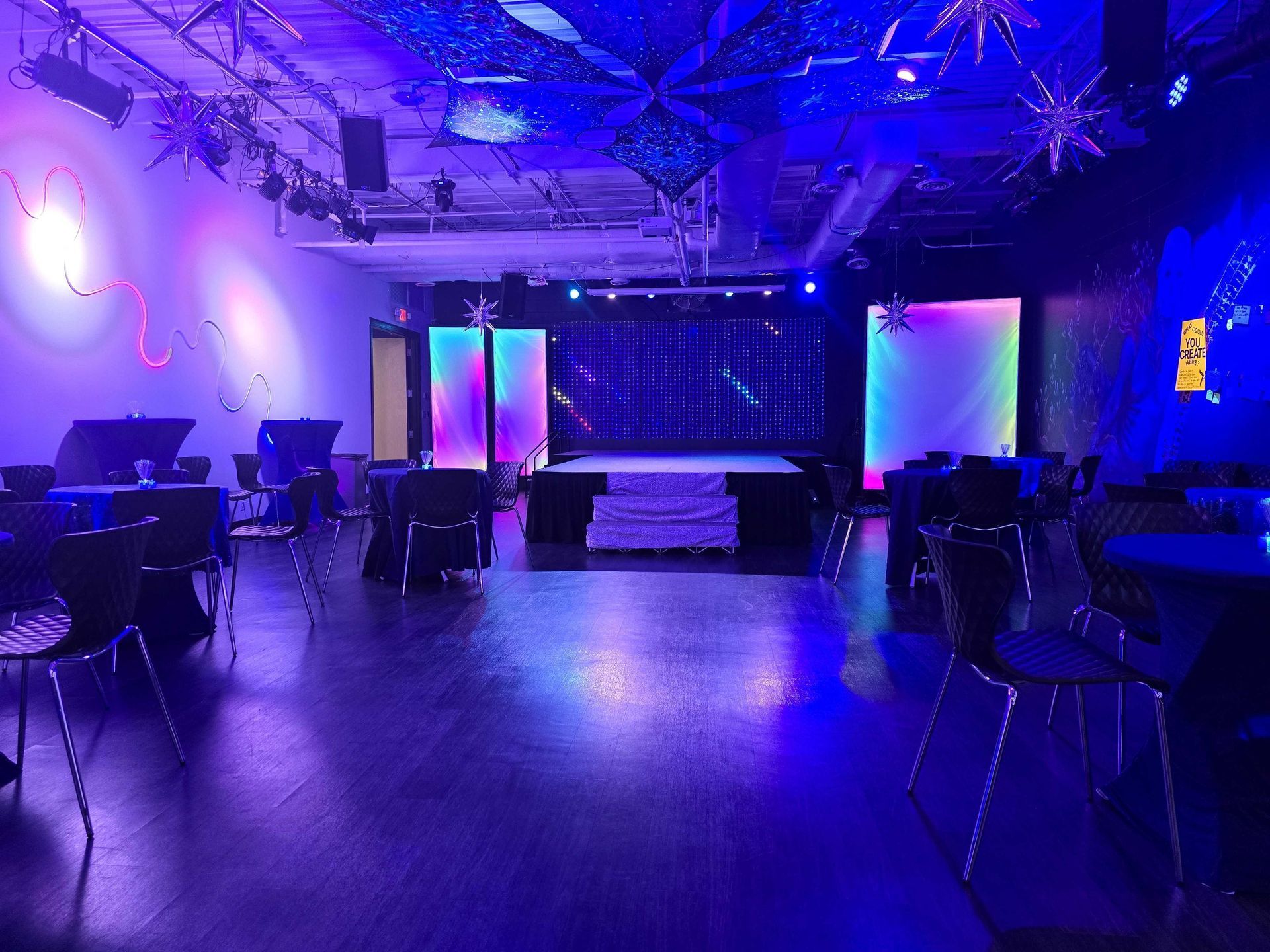 Our space has been designed to make approaching creation and art more fun with beautifully designed rooms and support from an artistic, creative community. The rest of our space is a very neutral community center, so you shouldn't feel apprehensive about visiting just because we've gone "all out" in our interior design for these rooms. Our space was also designed for content creators and artists just as much as it was for community gatherings and fun parties.